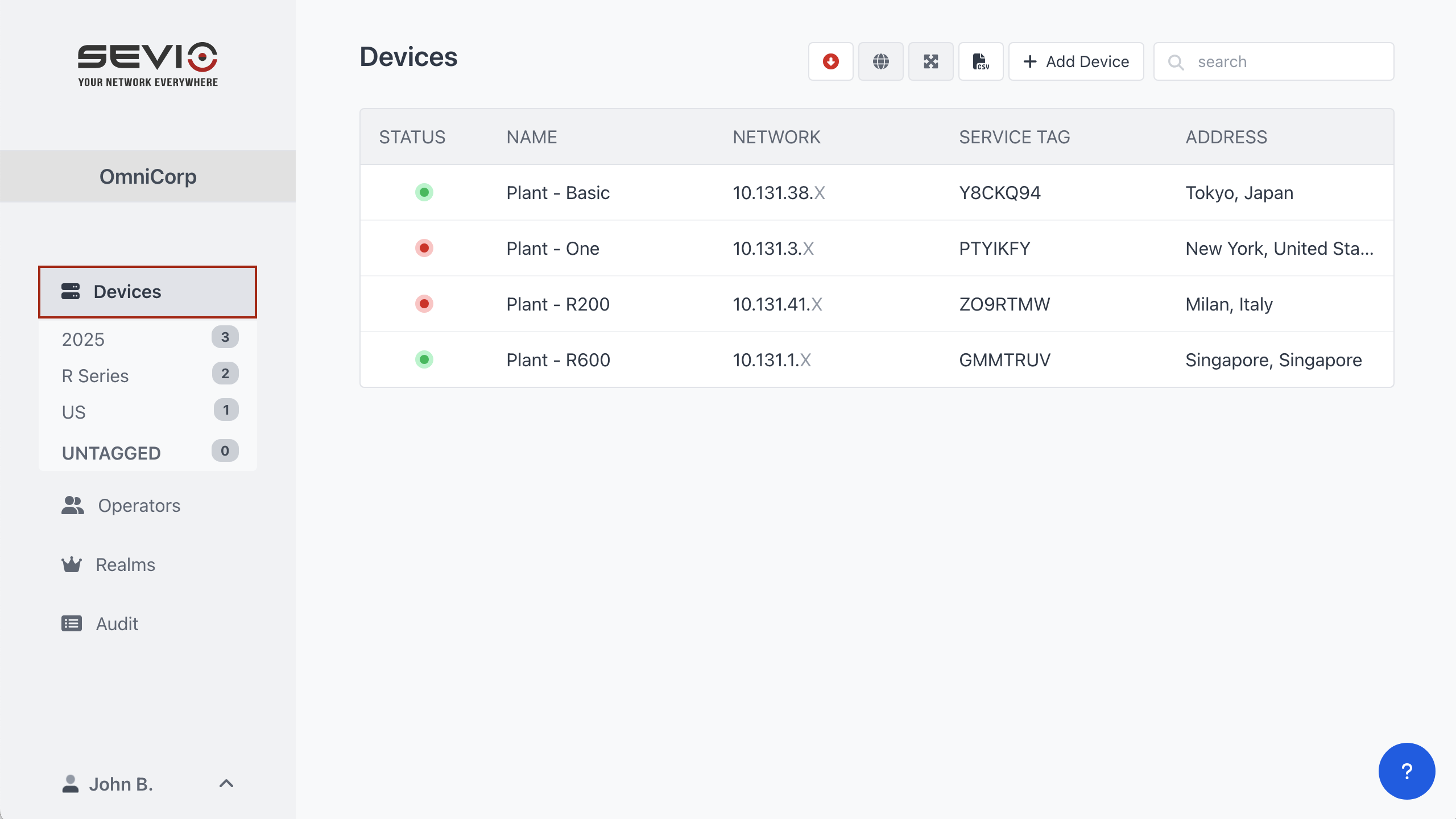 The Device list provides an overview of Sevio Routers associated with the current Realm.