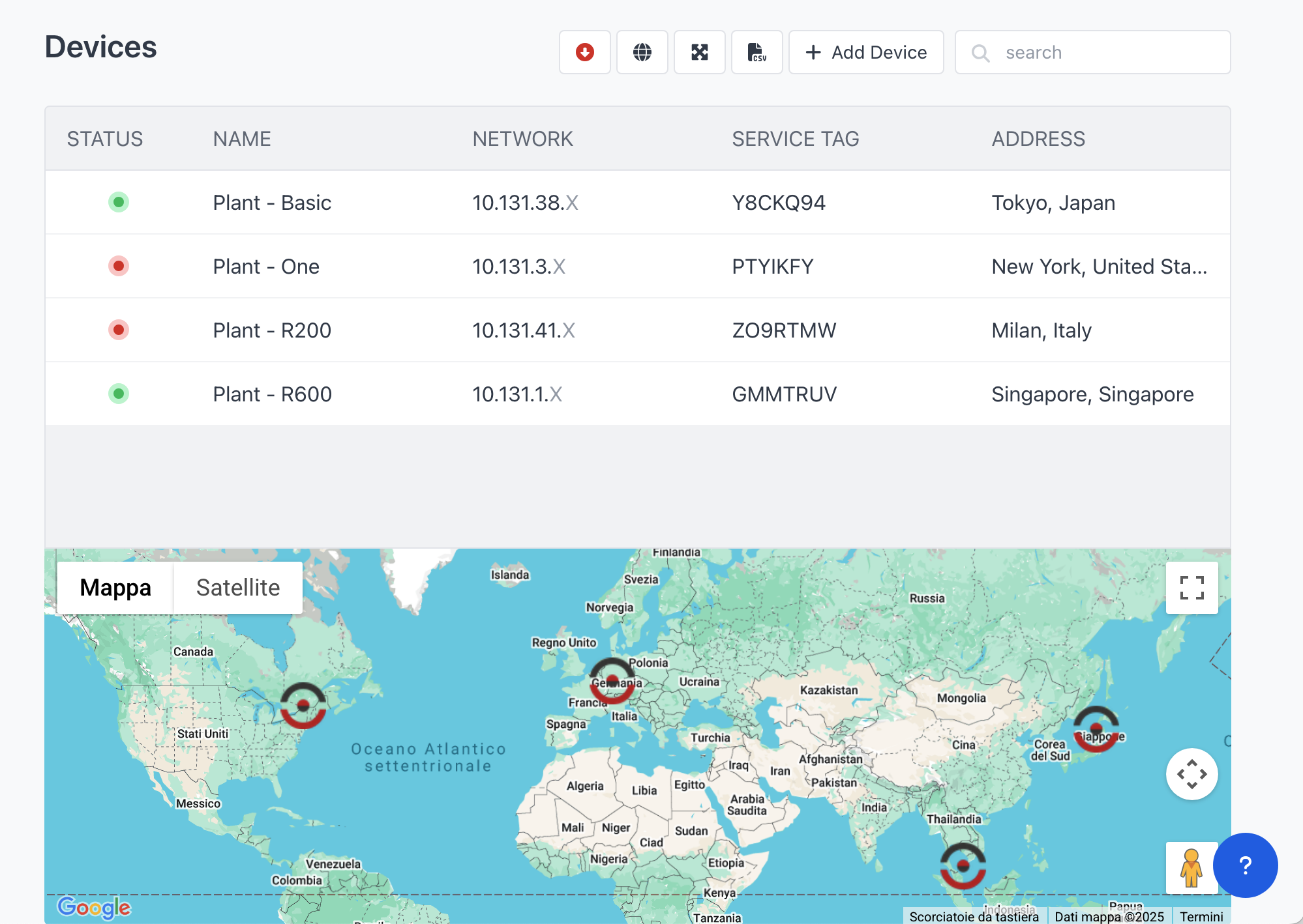 It allows you to search for Devices, applying filters to refine the results, such as Router name, Service Tag, Service Network, address, and Tags.