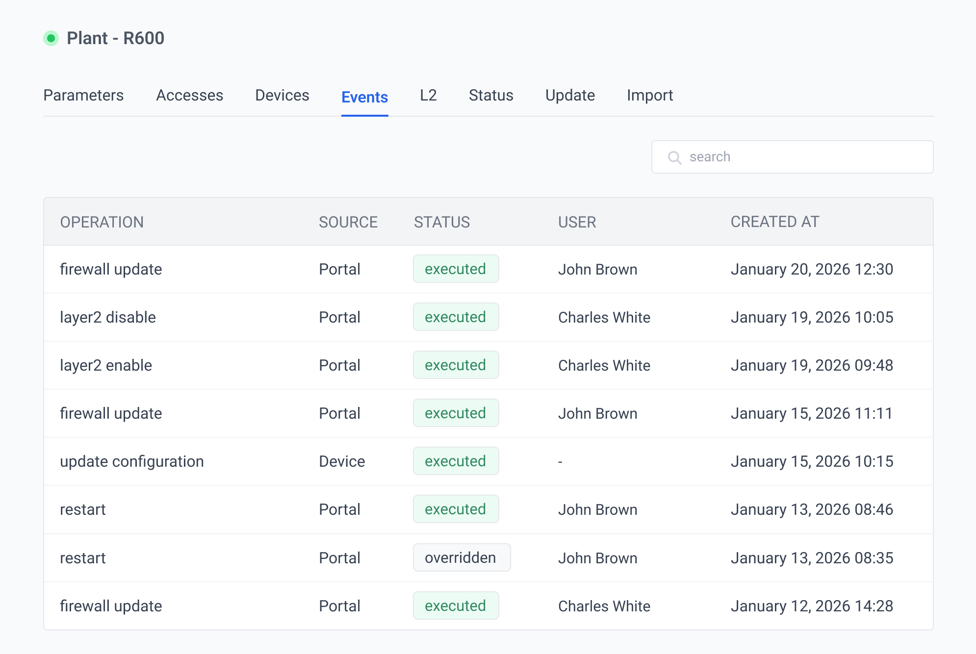 The Events Submenu in Sevio Portal allows you to monitor Router's activities and changes, including: