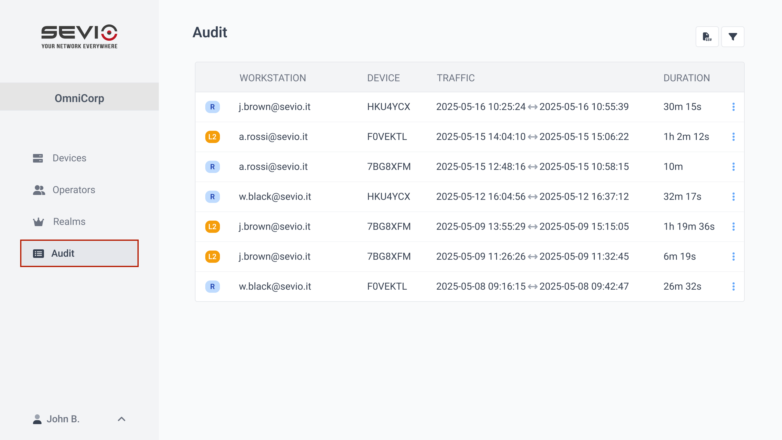 This feature allows monitoring the activities of each Workstation towards the associated Sevio Routers, providing effective control and greater transparency over accesses.