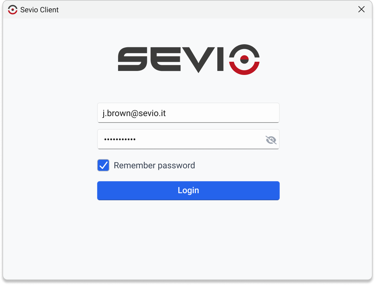 During login, enter the credentials (email and password) used for Sevio Portal. Select Remember password to enable automatic reconnection.