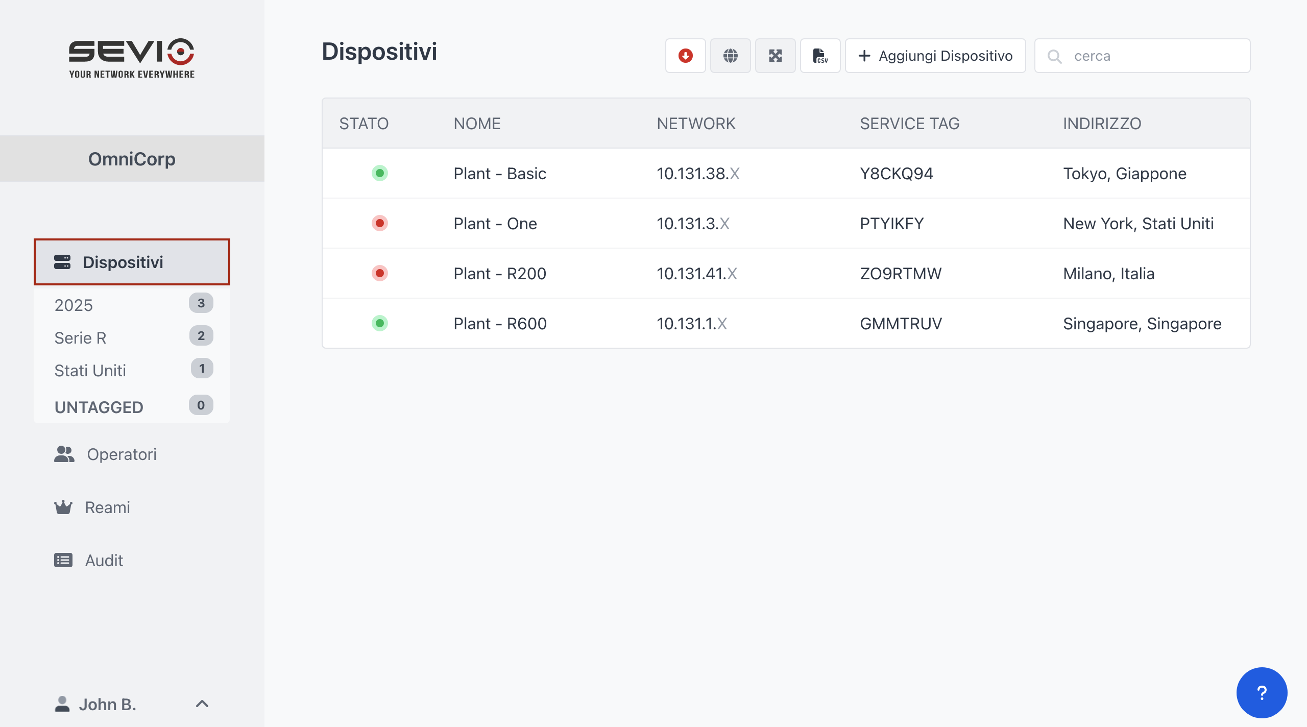 La lista dei Dispositivi mostra i Sevio Router appartenenti al Reame corrente.