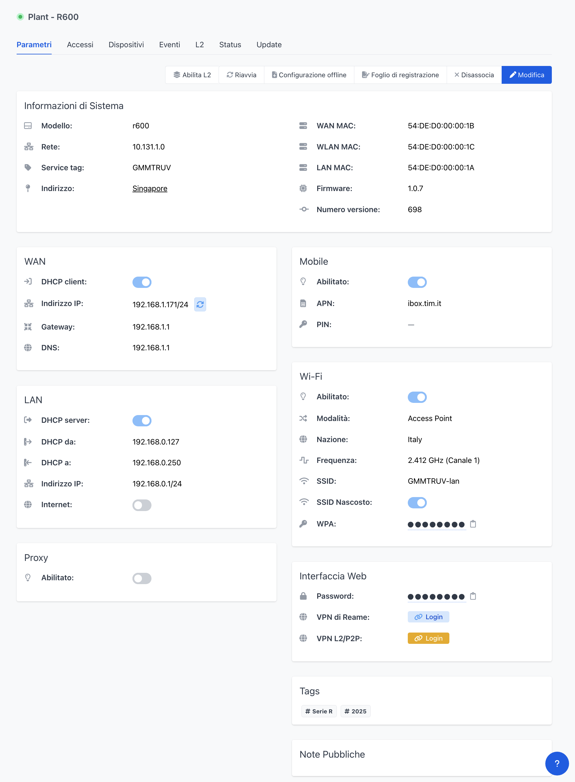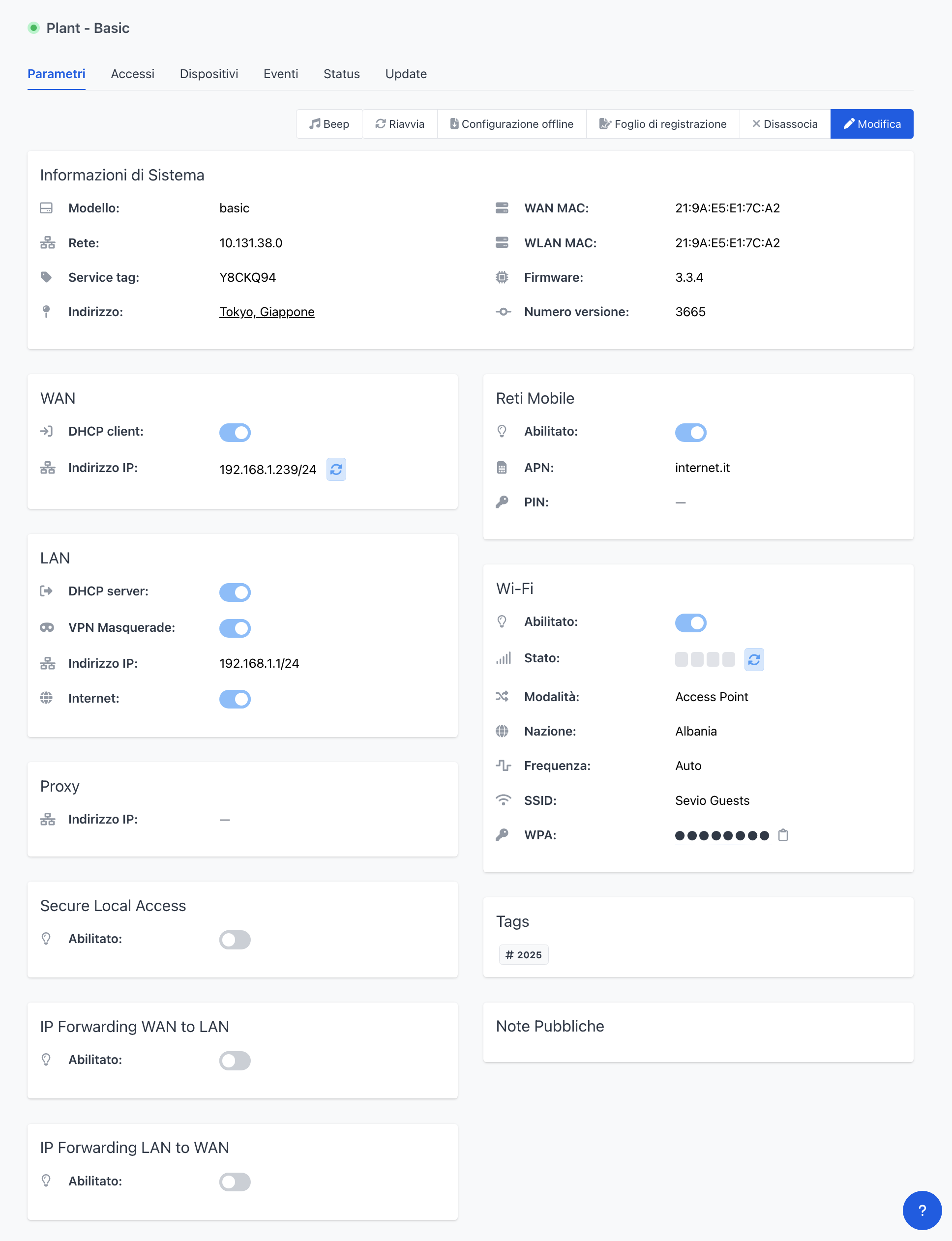 Nel Submenu Parametri di Sevio Portal sono disponibili le informazioni e le configurazioni principali per la gestione del Router.