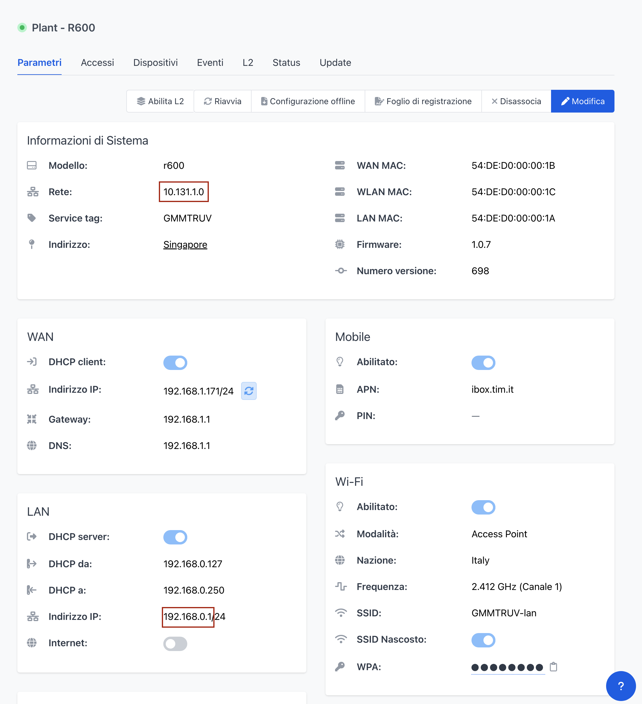 • Password: disponibile in Sevio Portal, nella sezione Dispositivi > Submenu Parametri > Panel Interfaccia Web.