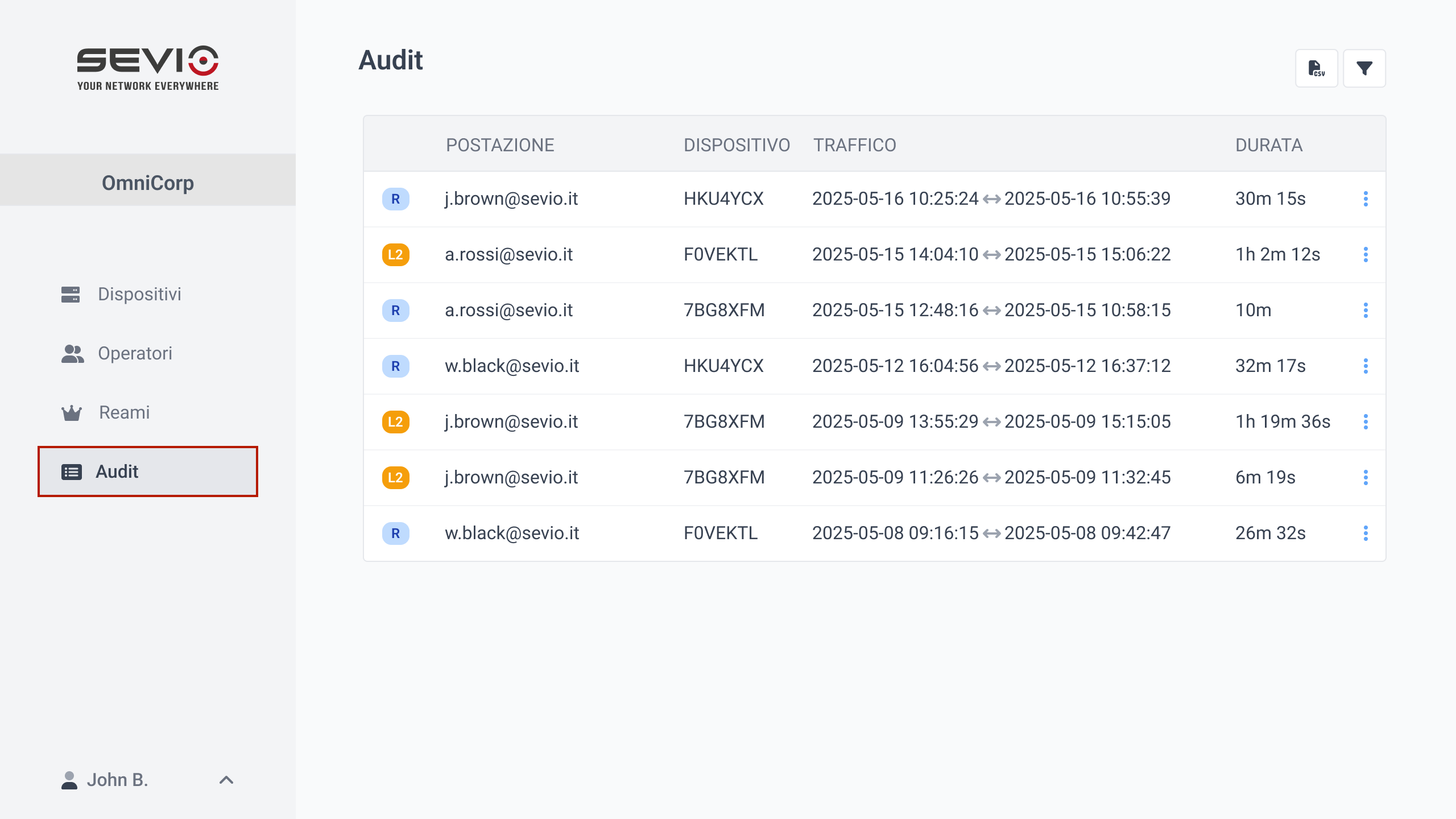 Dalla sezione Audit di Sevio Portal è possibile monitorare le sessioni di accesso ai Dispositivi, tramite connessioni di tipo VPN Realm e VPN L2.