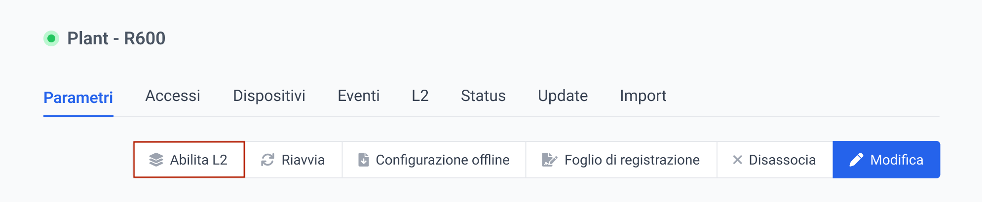 La connessione in Layer 2, oltre a essere gestita tramite OpenVPN, deve essere abilitata e disabilitata attraverso l’apposito button disponibile nella sezione Dispositivi > Submenu Parametri di Sevio Portal.
