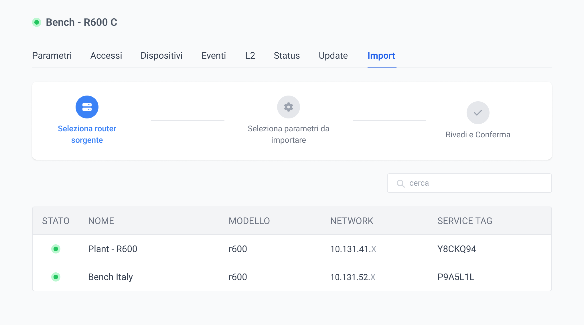 | Selezionare Router sorgente | Scegliere il Dispositivo sorgente dalla lista filtrata. La lista comprende solo i Dispositivi compatibili con quello di destinazione, appartenenti allo stesso Reame, modello e versione firmware. | |